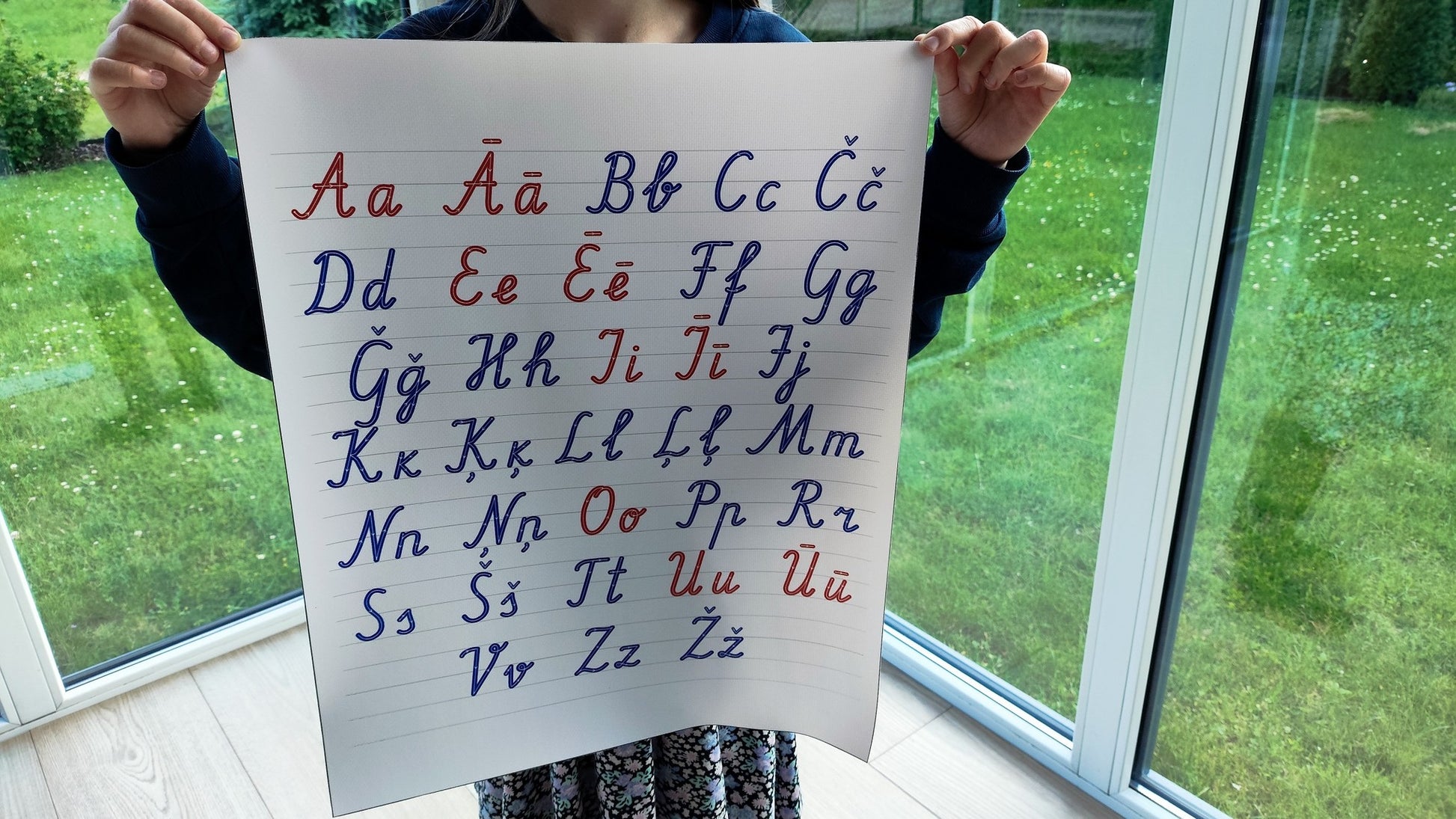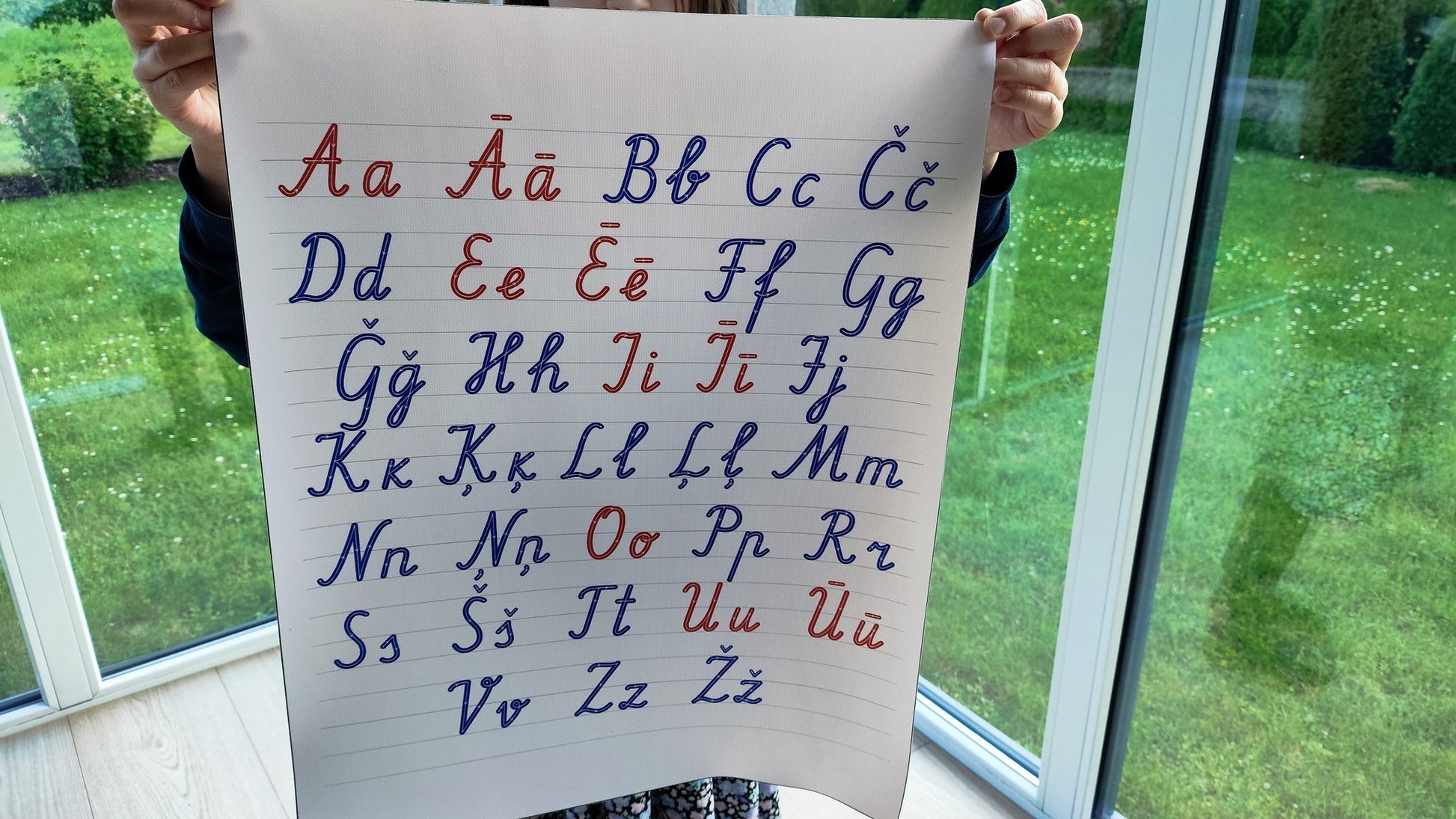 8€ ALFABĒTA PLAKĀTS. Rakstītie burti līnijās - lielie un mazie burti ar rakstības virziena bultiņām. Drukāts uz banera materiāla. Izmērs 40 cm x 50 cm.
